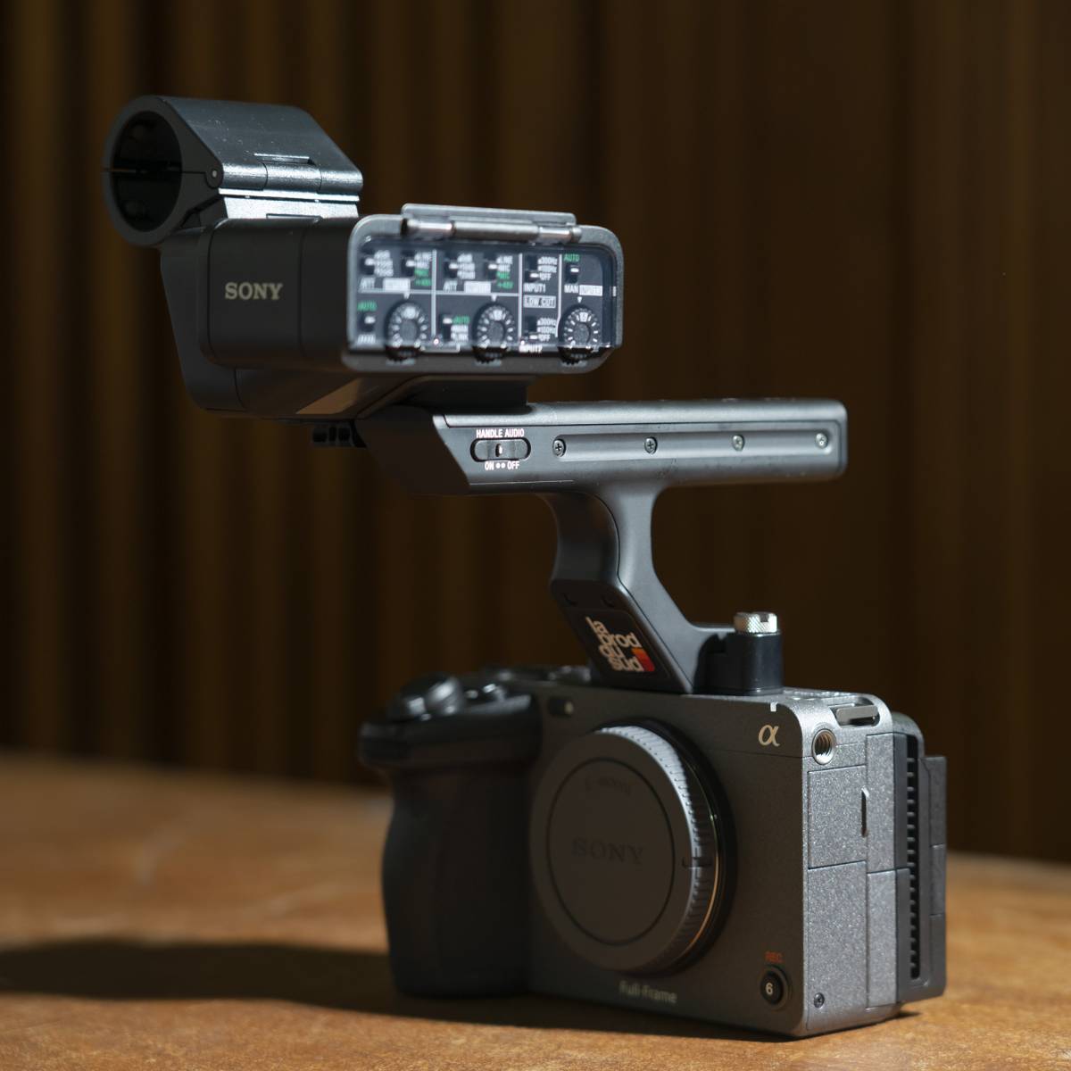 The Sony FX3 has a sensor stabilized on 5 axes, however it does not have an eyecup and its removable top handle has 2 XLR3 audio inputs.